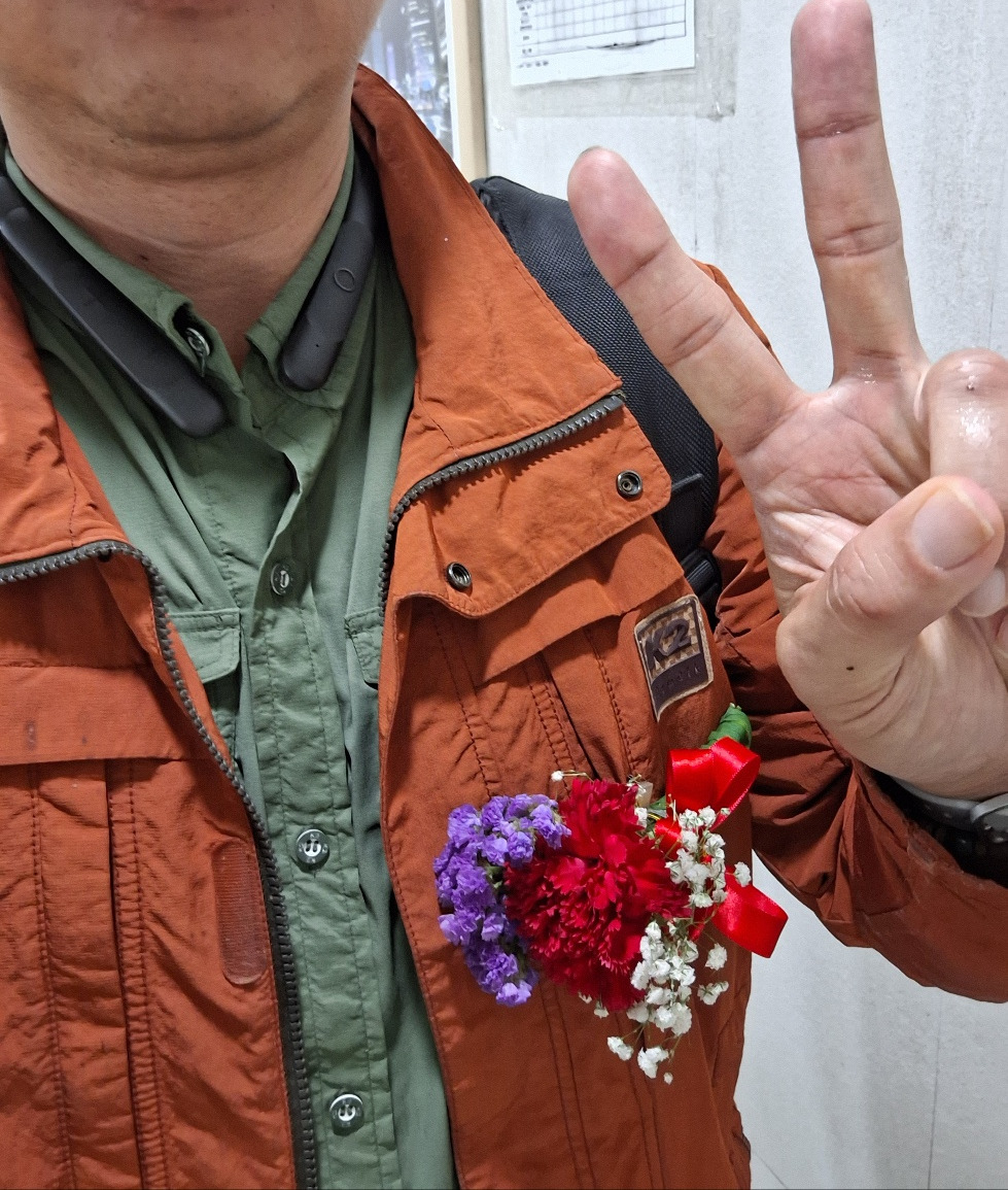 그것도 모른채 길위에여행 카페를 통해 모임을 진행하려고 시청역에서 사람들을 기다리고 있었다. 참석한 분들중에 나한테서 도심여행해설가 양서과정을 수료한 분도 계셨다. 그분이 조심스레 다가와 나에게 꽃을 달아주셨다. 깜짝 놀라 괜찮다고 사양했지만 '나에게는 선생님이 맞습니다. 그러니 받으세요'라고 하시며 달아주신다.