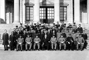 1918년 촬영한 사진. 가운데 모자 벗은 사람이 고종, 왼쪽이 의민태자(영친왕), 오른쪽이 순종, 순종 옆이 의친왕 ->