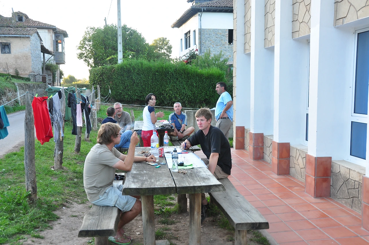 먼저 도착한 순례자들은 자리를 잡고 밖에 벤치에 앉아 휴식을 취하기도 하고 빨래를 널고 있었다. 우리도 부랴부랴 샤워를 하고 빨래까지 마치고 밖에 앉아 낮에 샀던 알콜음료를 마시고 있었다. 이곳에서 순례길 걷는동안에 만났던 순례자들을 다시 만났고 반가움에 인사를 나누며 자기가 가져온 와인이나 맥주를 마시며 얘기를 이어갔다. 그런데 어느누구도 저녁식사 준비를 하지 않고 있었다. 왜 그럴까?