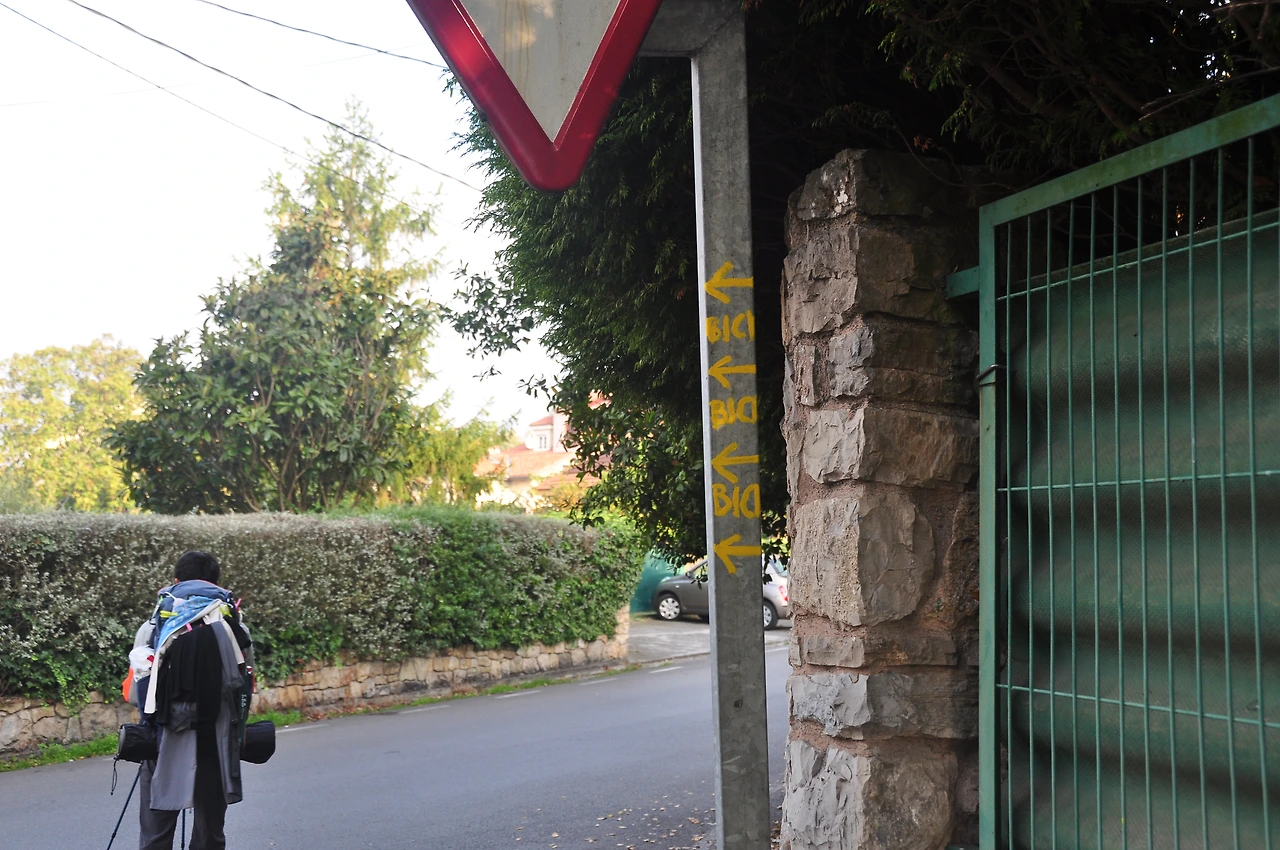해변에서 노란 화살표를 벗어나 알베르게를 찾는 순례길을 이어갔다. 바닥에도 가리비표시가 붙어 있는데다 자전거순례길과 걷는 순례길이 구분되어 있어 접촉사고가 날 일이 없는 곳이 순례길이다.