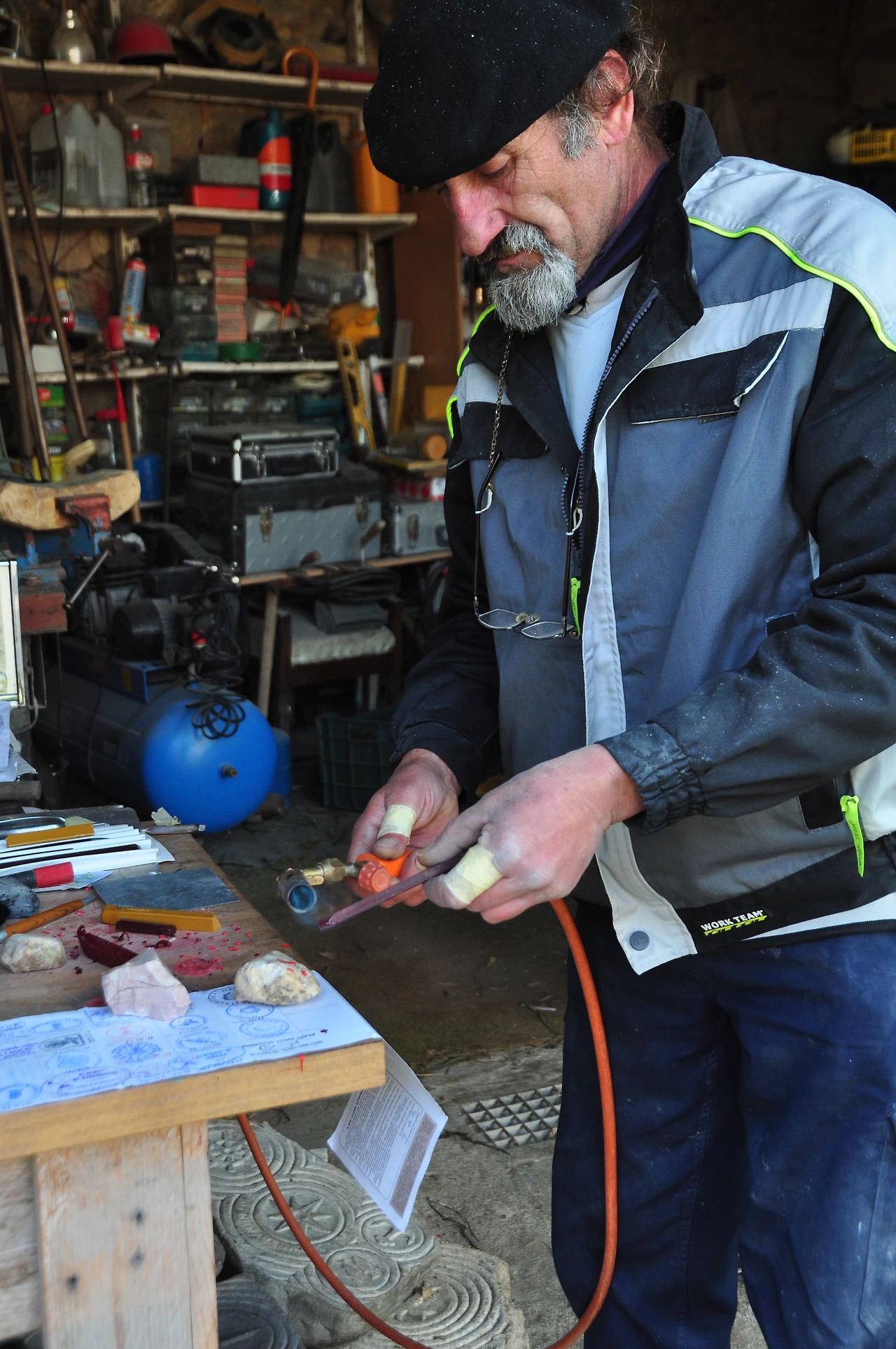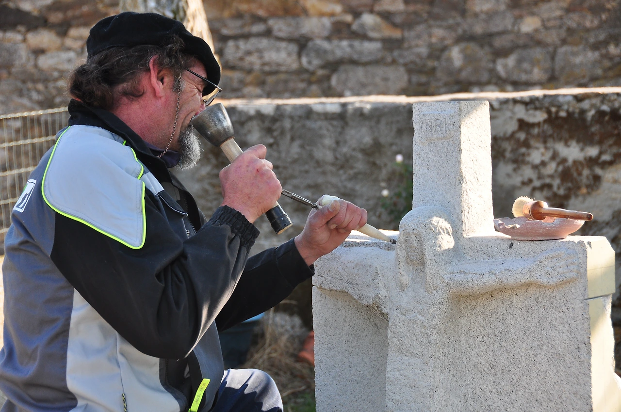 순례길에 음악소리가 들려온다. 사람들이 얘기하는 소리도 들려왔다. 조각가가 열심히 정을 들고 돌을 쪼고 있었다. 그 소리도 신기하지만 지나가던 순례자들이 여기에 멈춰서서 구경하고 있었다. 그중에 실비아도 있었다. 지나칠까 하다가 우리도 조각가의 집에 들어섰다.