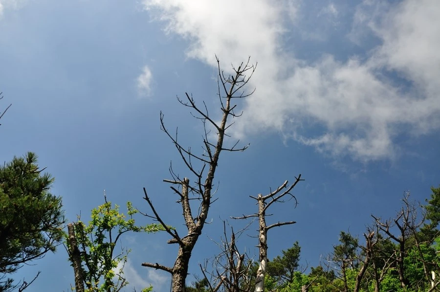 바리메오름 정상에서 내려가는 길에는 고사목들이 많다. 흡사 태백산이나 지리산 고사목지대에 들어선 느낌이다.