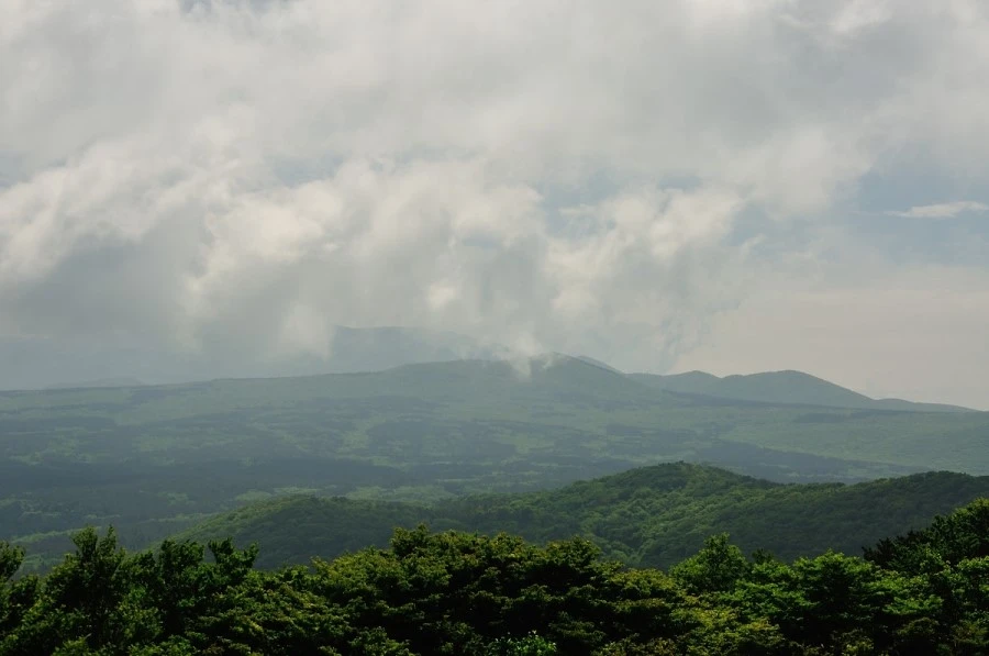 오름위에서 올려다본 한라산 방향... 구름에 가려 있지만 남벽이 선명하게 보인다.