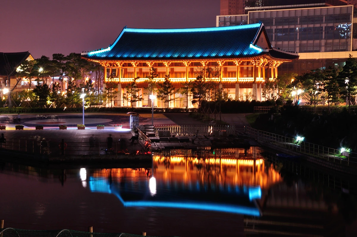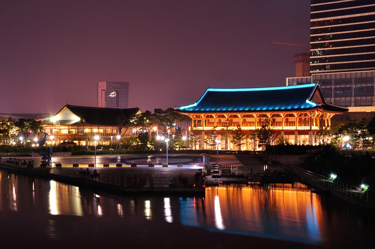 중앙공원에서 가장 눈에 뜨인 야경의 모습은 푸른색 기와가 인상적인 한옥 건물이다. 기와 사이사이에 조명을 설치하여 기둥과 청와의 모습이 너무나 아름답게 보인다.