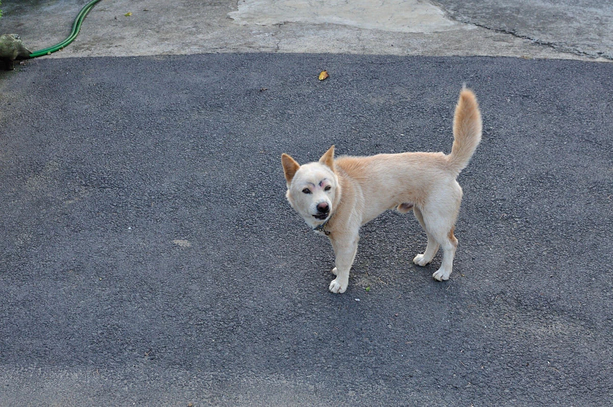 가까이에서 본 개의 모습에 빵 터지게 웃고 말았다. 개의 눈위에 눈썹이.... 너무 어색하다. 개 주인이 그려놓았는지 너무가 우수꽝스럽다. 짱구를 닮은 일자 눈썹이라니...