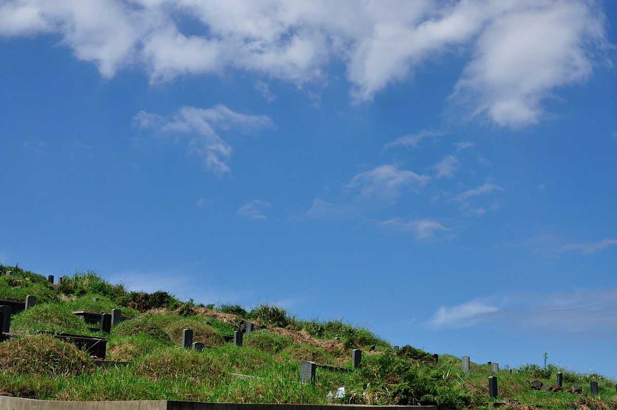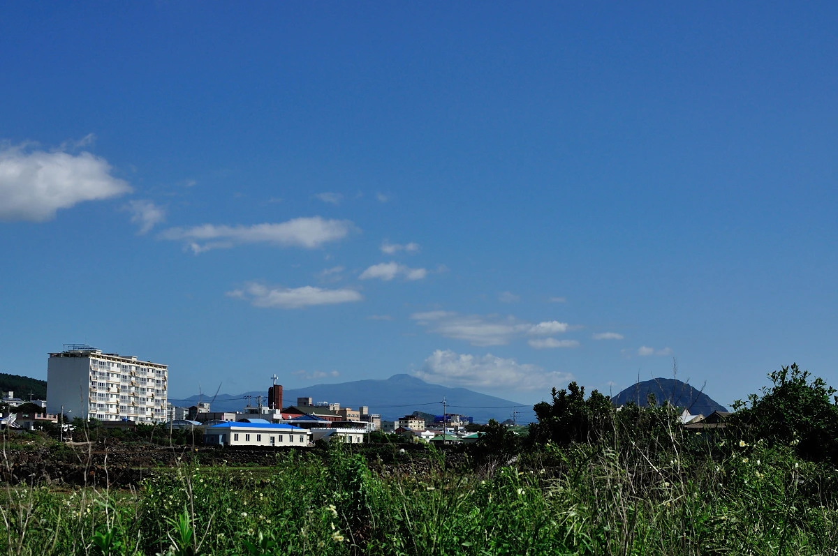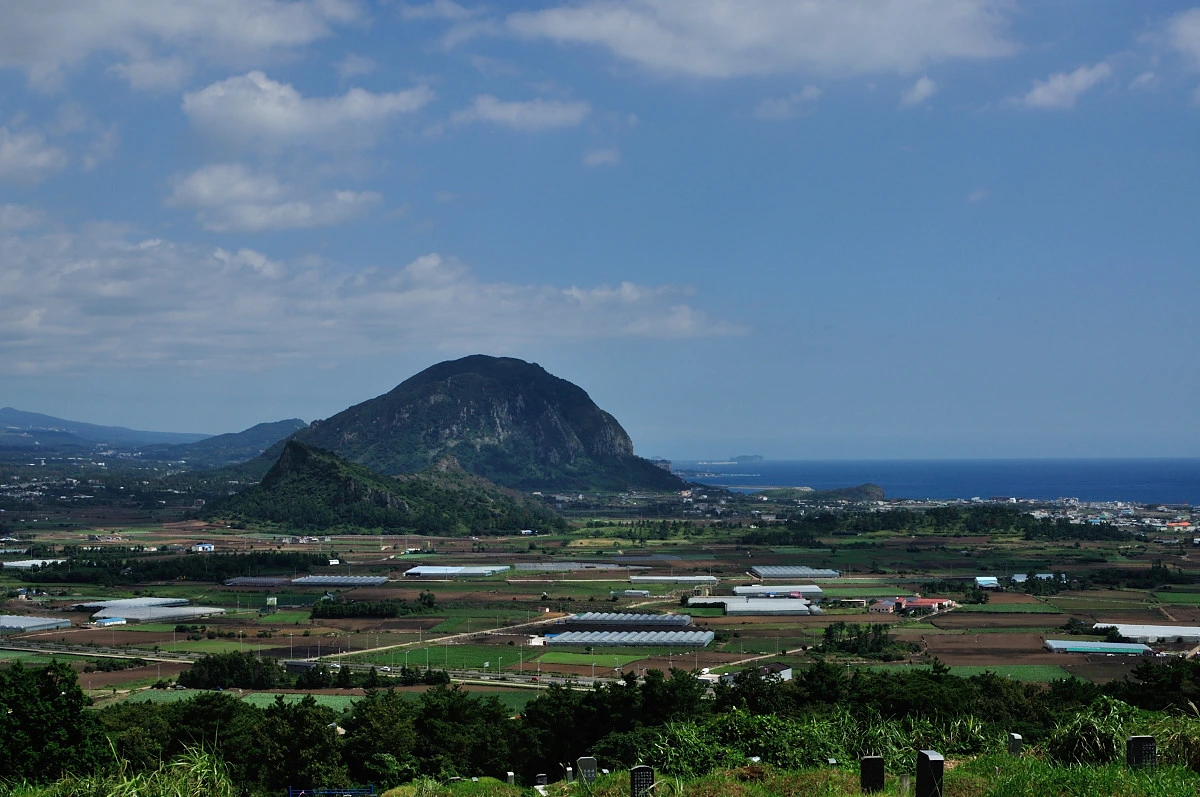 모슬봉 옆 숲길을 따라 계속 걸어가니 묘지터가 나온다. 그리고 하늘아래 엷은 구름이 살짝 가리워진 한라산의 모습도 깨끗하게 볼 수 있었다. 그리고 왼쪽방향으로 시선을 돌리니 한라산의 능선을 따라 군데군데 오름이 솟아있는 작은 산 모습이 펼쳐진다. 다시 오른쪽으로 시선을 돌리면 푸른바다가 어우러진 산방산에 뾰족한 생김새가 개성있게 홀로 툭 튀어 보인다.