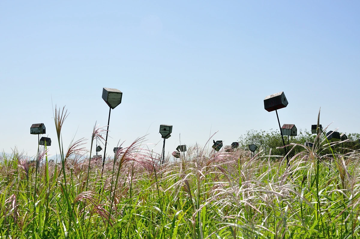 올해 하늘공원에서 찾은 독특한 풍경이 하나 있었다. 지난해에는 공원 중앙에 해바라기꽃 단지가 있었는데 지금은 황금색 코스모스가 그자리를 대체했고 억새숲 넓게 새집이 거꾸로 달려 있는 이색 풍경을 볼 수있었다. 새집마다 참새들이 들어가 자지집임을 과시 하는듯 하다.