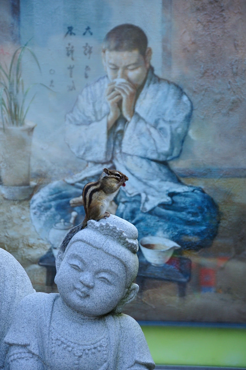 선재길의 마무리는 항상 상원사에서 끝맺음을 한다. 이번에는 적멸보궁이 있는 곳까지 다녀오려 하였으나 역시나 시간에 압박때문에 상원사 대웅전 앞까지만 다녀왔다. 그곳에서 아기동자 머리위에서 무언가 먹고 있는 다람쥐가 보인다.