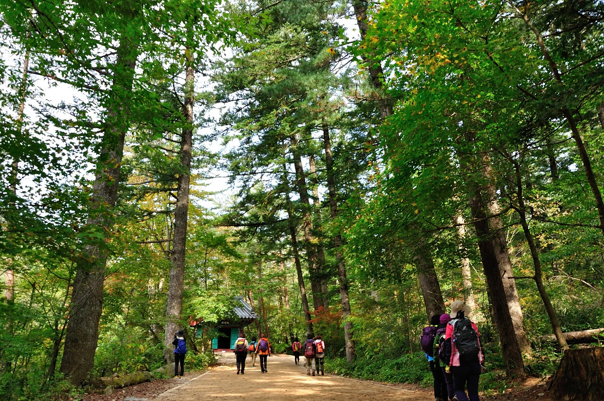 오대산국립공원 입구를 지나 버스에서 내려 전나무숲길을 따라 우선 마음을 가라앉히듯 차분히 걸어본다. 전나무의 푸른색깔이 강하기 때문에 아직 붉은 단풍의 느낌을 받을 수 없다. 하지만 상심하기에는 아직 이르다. 선재길은 아직 시작도 안했으니까...