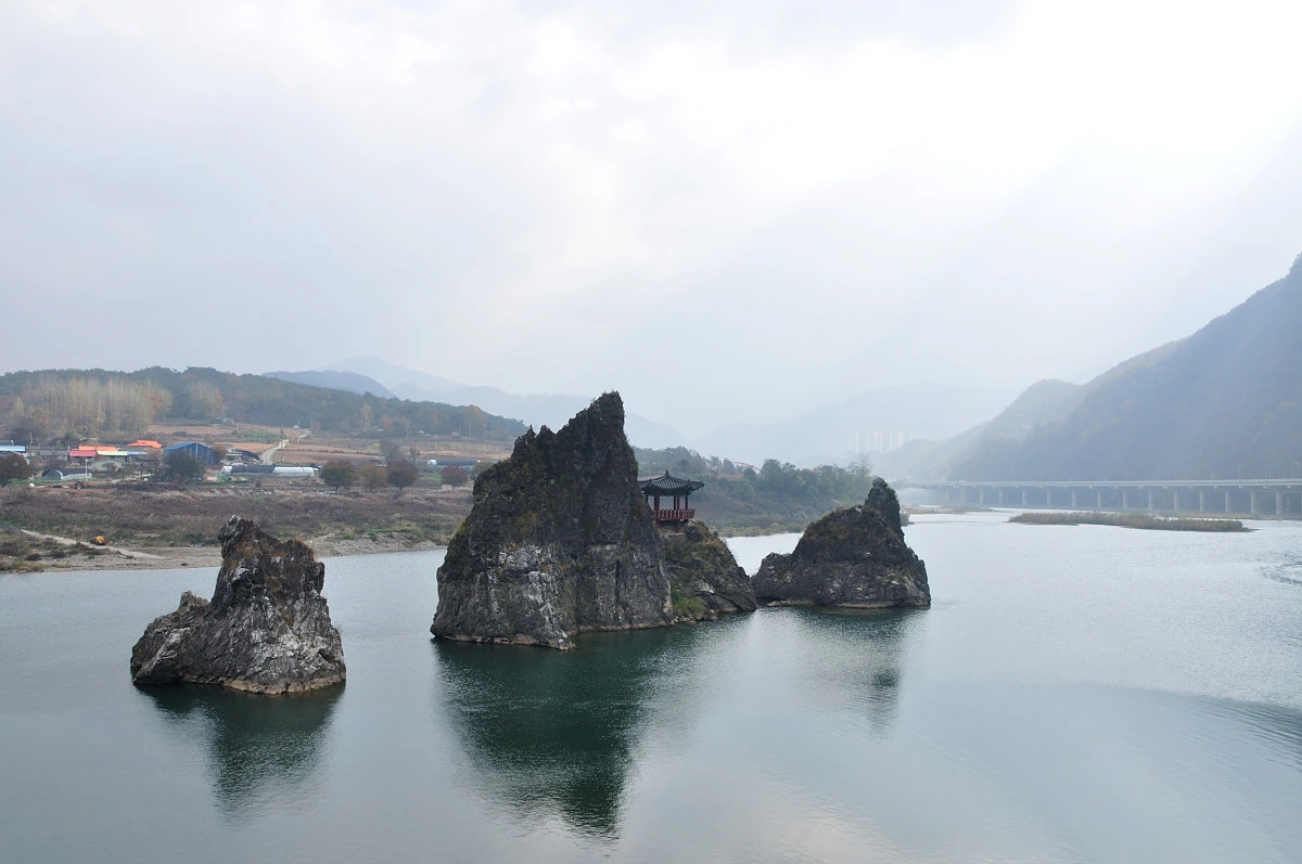 도담삼봉이이 내려다보이는 휴계소에서 이른 점심을 먹고, 다시 버스에 올라 구인사로 향한다. 아래 주차장에 도착하여 본격적인 걷기여행에 나선다.