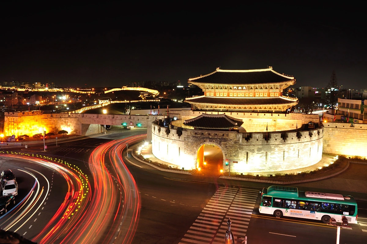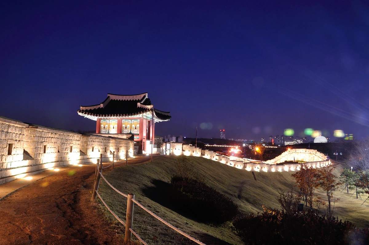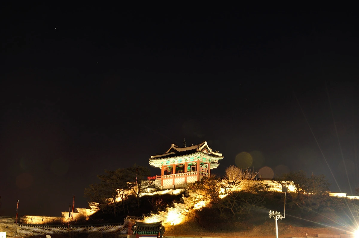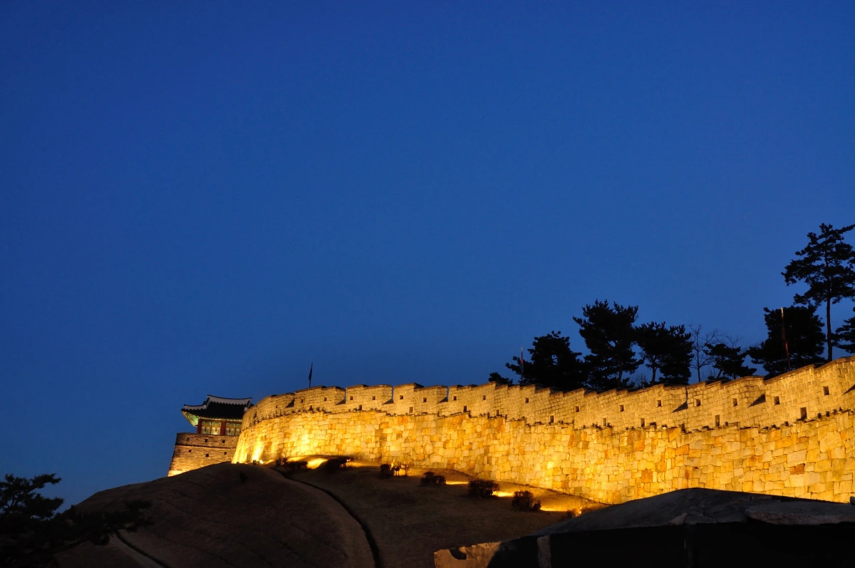 낮보다는 해가 진 저녁에 더욱 아름다움을 발하는 수원화성이다.