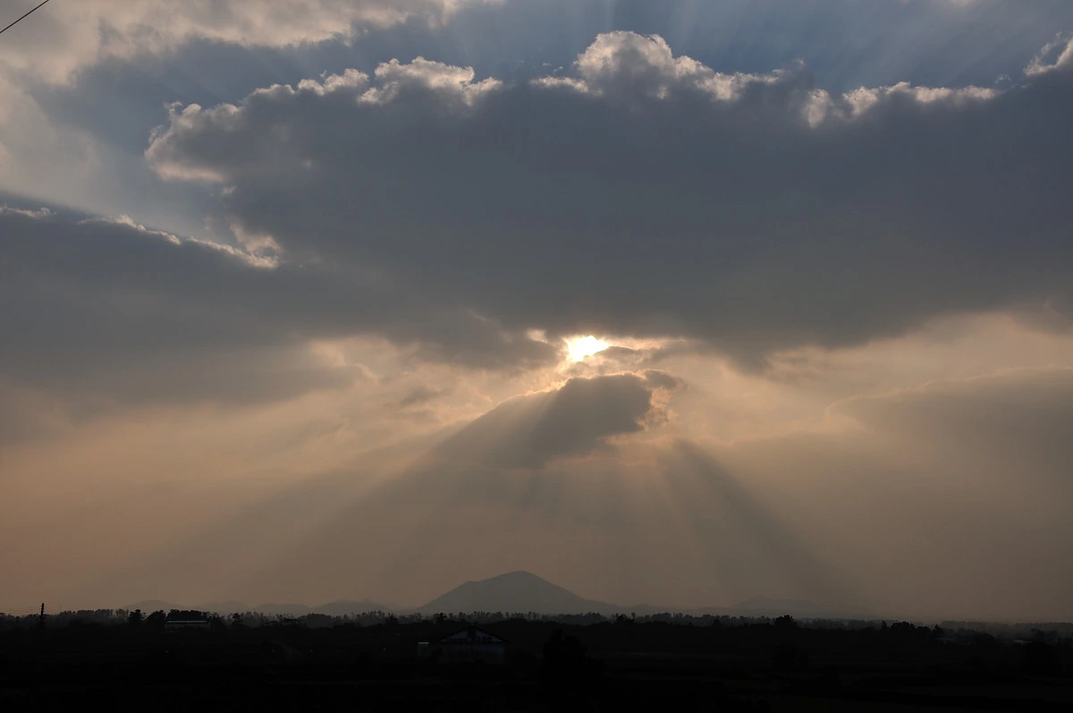 전시된 사진을 그냥 보고 나오려고 했지만 움직이는 발을 붙잡는 매력을 뿜는 사진들이 있다. 오름옆에 올라서는 무지개의 사진이 그러하고, 컬러사진이지만 흑백처럼 단아하게 보이는 오름의 사진이 그렇다.