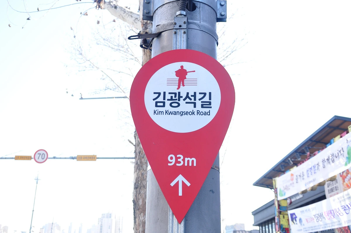 방천시장 초입을 깃점으로 주변에 '김광석길' 이라는 이정표가 곳곳에 설치되어 있고, 도로변 깃발 속에 그려진 김광석님은 찾오오는 사람들에게 웃음을 던져주고 있었다.
