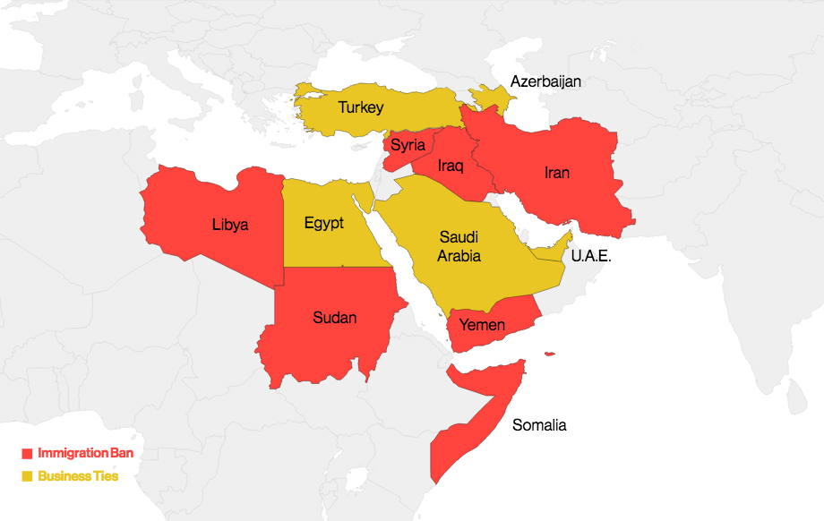 트럼프 대통령은 9/11 테러와 같은 사태를 막기 위해서 7개국에 대해서 비자 금지령을 내렸다고 설명했지만, 정작 9/11 테러 주범들의 출신 국가들은 이번 무슬림 비자 금지령에서 제외됐다. 지도에서 볼 수 있듯 9/11 테러 주범 19명 중 15명이 사우디아라비아 출신, 나머지는 UAE, 이집트, 레바논 출신이지만, 그 중 단 한 곳도 이번 비자 금지령의 대상이 되지 않았다. 트럼프 본인의 비즈니스가 있는 국가들은 제외, 엉뚱한 이슬람 국가들을 지정, 비자를 전면 금지한 것이다.