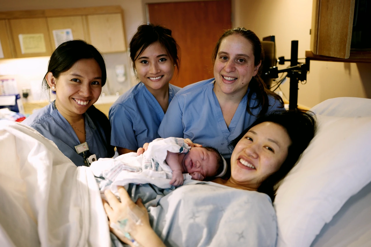 아기를 낳을 때 초록색 수술 가운 같은 천으로 다 가리고 낳는 줄 알았다. 여기선 가리긴커녕 아이가 나올 때가 되자 침대 위에 설치되어 있는 무대조명 같은 걸 켰다. 남편, 엄마, 간호사, 의사 모두 환하게 밝힌 조명 아래에서 내 다리 사이를 보며 나를 응원했다. 남편이 출산하는 장면을 보는 게 부끄럽다는 산모들도 있던데 오히려 든든했다. 한 손을 꼭 잡고 잘 하고 있다고 격려해주는 남편이 있어서 다행이었다.