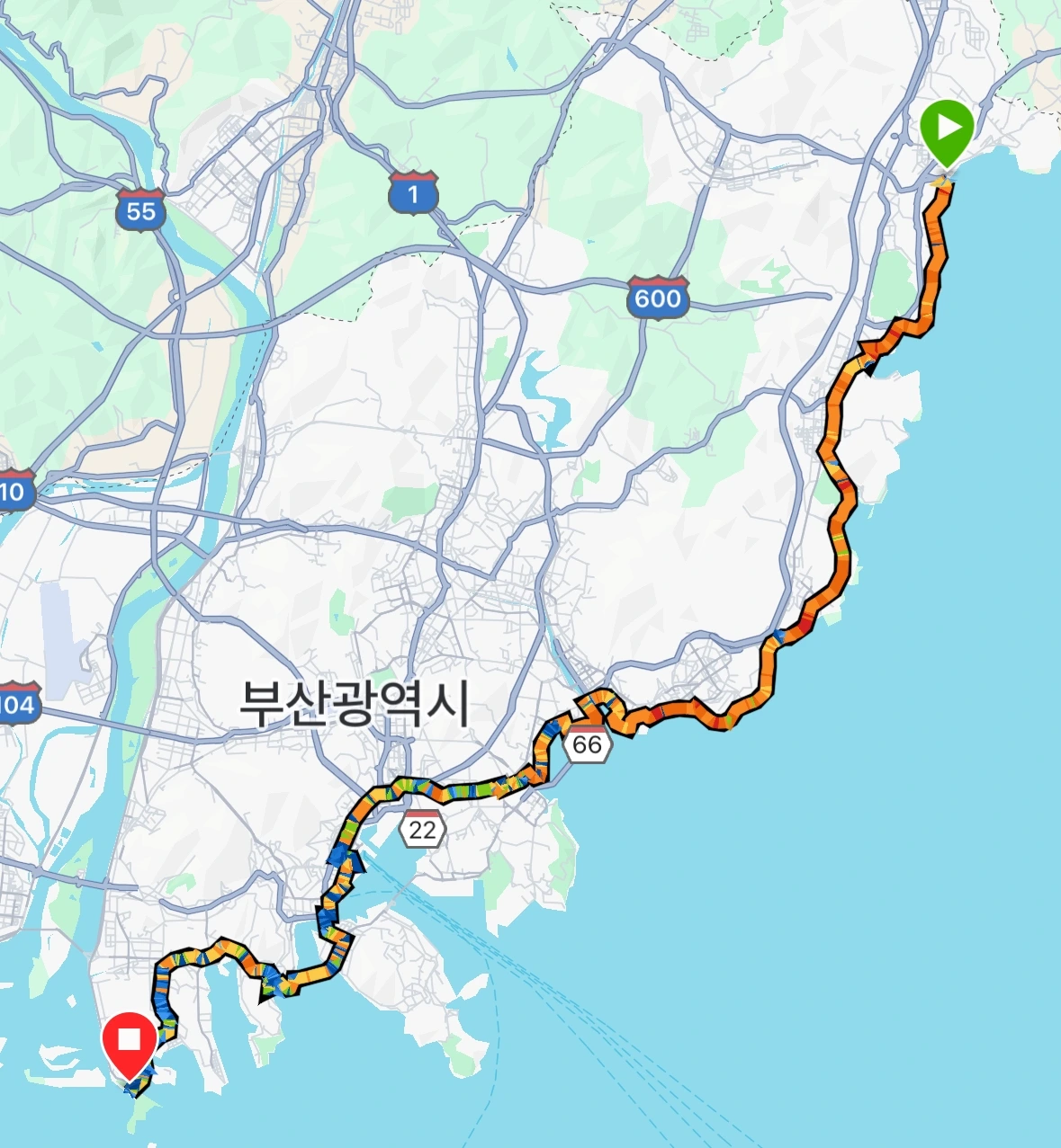 임랑에서 광안리 까지 약 30km 정도를 달리고 나니까 다리통증이 시작되었다. 풀코스 달리기라면 12km 만 참고 달리면 되지만, 이번 도전은 왔던 거리만큼 더 달려야 한다는 부담감이 엄청 컸다. 이제부터 본격적인 정신력 도전이었다.