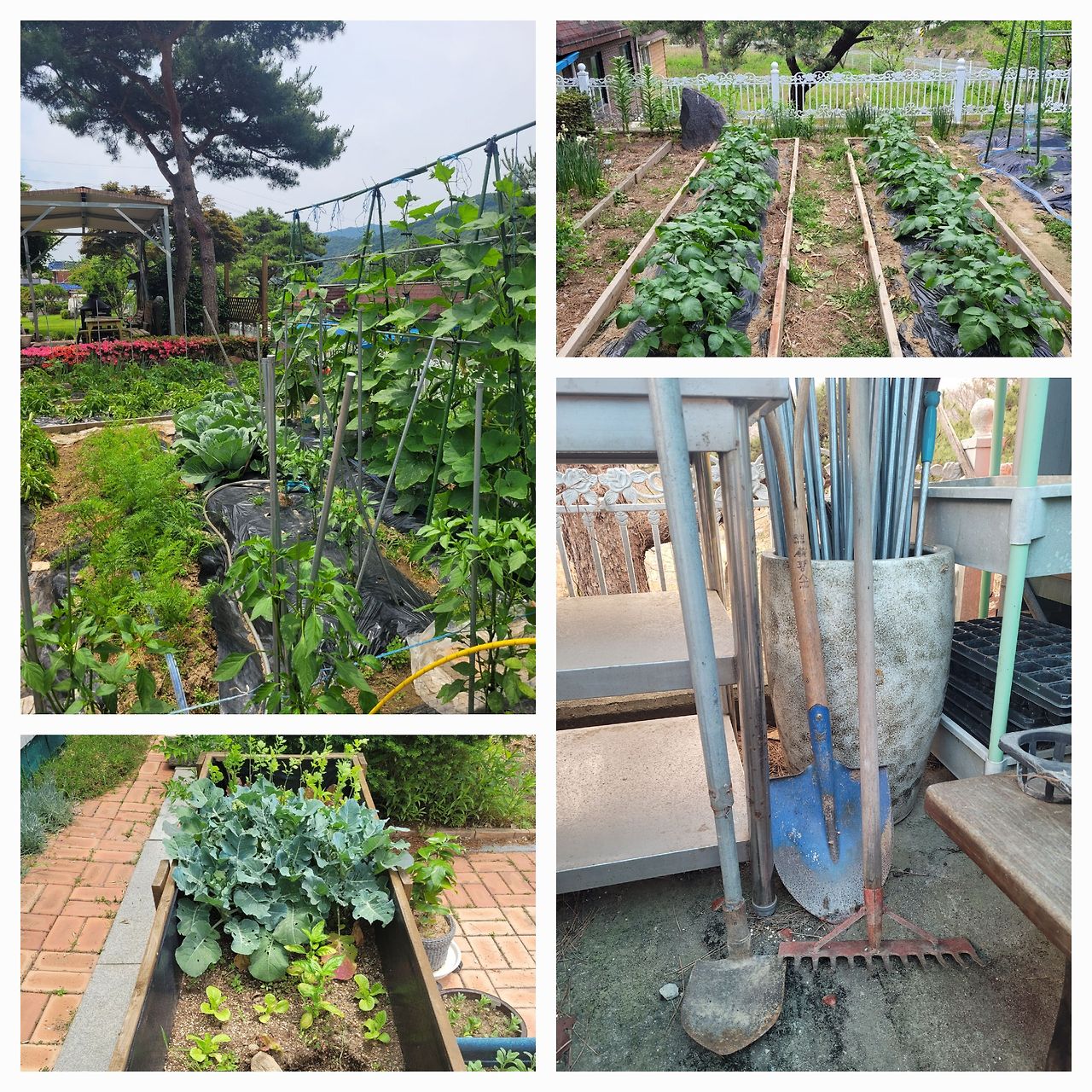5월엔 상추와 시금치를 수확하고 감자, 오이, 호박, 고추, 토마토의 순을 질러줍니다. 이때쯤 오이, 호박과 고추, 방울토마토를 위한 지지대를 단단히 설치해 줍니다. 하순에는 고구마순과 실파를 종묘사와 시장에서 사다가 심습니다. 6월에 하지가 지나 잎이 마르면 감자를 캐고 퇴비를 보충한 후 임시로 열무나 상추를 키웁니다. 이곳은 나중에 김장채소를 키우게 됩니다.