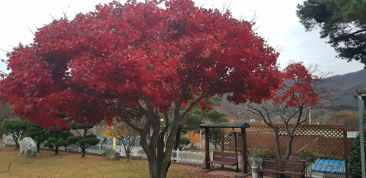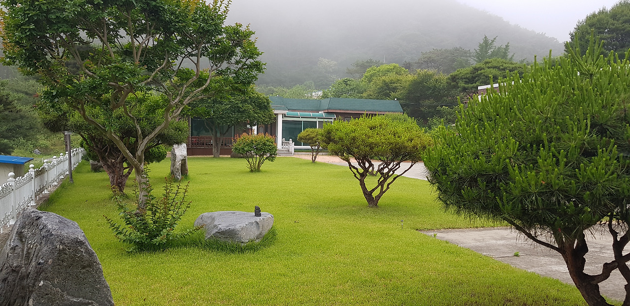 이삿날 잔디마당. 6반송, 3단풍, 2배롱, 2향나무, 2동백, 2회양목, 2장미, 오엽송, 모과, 자두, 꽃사과나무가 심어져 있었다.