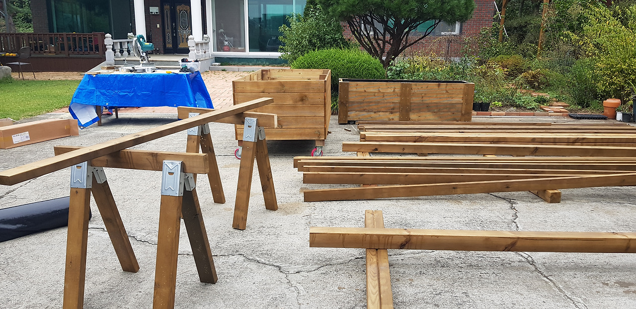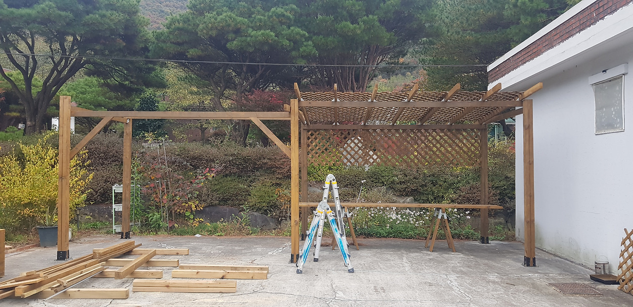 사서 고생도 했다. 퍼걸러, 울타리, 수돗가 비가림, 플랜트박스 여섯 개. 모두 방부목으로 직접 만든 것들이다. 퍼걸러와 비가림은 시내 철물점에서 빌린 해머드릴로 시멘트 바닥에 구멍을 뚫고, 각재용 FBP55 철물을 앙카볼트로 고정시킨 다음, 각도절단기로 자른 기둥용 목재를 세워 육각 머리 피스로 고정하고, 지붕엔 2by4 방부목을 얹어 피스나 브래킷으로 고정한 후, 래티스로 덮어 후일 덩굴식물이 자리 잡을 수 있게 만들었다.