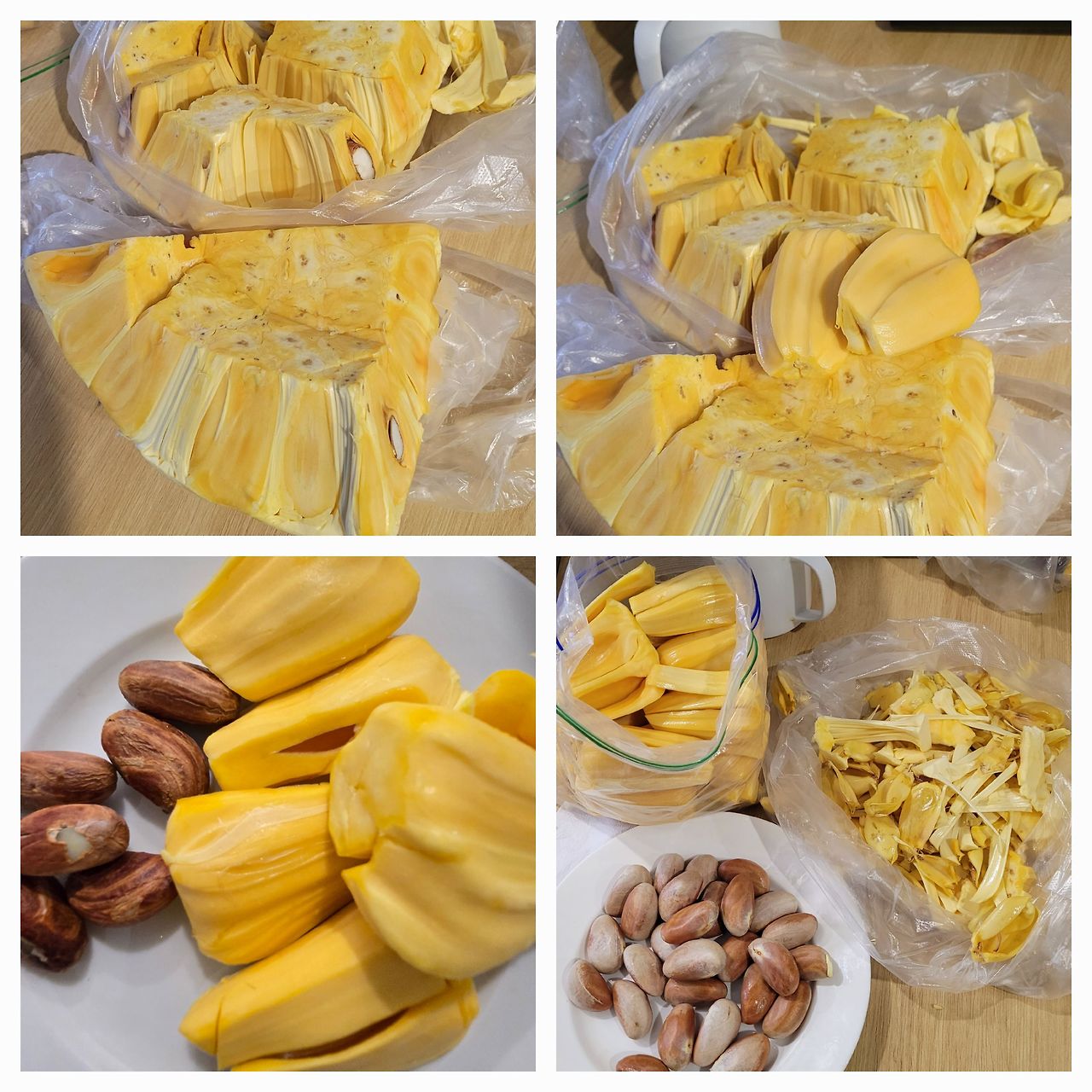 이걸 먹을 수 있는 기쁨도 "왜 다낭?"중 하나다. 나무에서 열리는 가장 큰 과일, 워낙 커 조각내서 판다. 돌기가 있는 외형 때문에 두리안과 자주 혼동되지만, 코감기가 아니라면 구분은 어렵지 않다. 열매 속에 알맹이 과육이 박혀있어 섬유질을 일부 제거해야 하는데, 이런 불편을 감수하면 연한 빛의 속껍질과 큼직한 씨앗도 챙길 수 있다. 씨앗은 삶아 먹는데 강낭콩 맛이 난다. 다녀보니 가게마다 값이 천차만별이다. 다행히 집 가까운 노점 아주머니가 가장 친절하고 싸게 판다. 일 년 만에 나타난 우리를 반갑게 알아보다니! 손질 안된 2kg이 70,000 vnd. 알맞은 당도, 쫄깃한 식감, 결대로 찢어지는 육질, 달콤한 향내, 건강에 좋은 효능까지 갖춰 채식주의자나 환자용 고기로 가공되기도 한단다. 열대과일? 내겐 망고보다 잭프루트다.