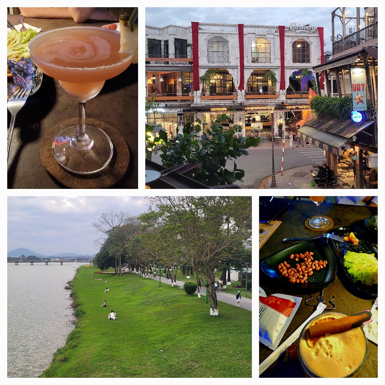 아직도 배꼽시계는 한국에 맞춰져 있다. 게다가 걷고 난 뒤라 배가 고파왔다. 2층에 자리가 없을까 봐 6시가 되기 전에 식당을 찾았다. 마침 해피아워라는 기쁜 소식. 아마도 내가 술 복이 있나 보다. 보통 하루 중 손님이 드문 시간대를 해피아워로 정하는데 시차 덕에 이렇게 가끔 얻어걸린다. 7시 반까지 주문하면 2+1, 넉넉한 시간이다. 저녁식사와 함께 이 지역 Huda 병맥주로 목을 축이고, 이곳 시그니쳐 칵테일을 추천해 달라고 하니 취향을 묻는다. 단 맛의 Mew Secret과 쓴 Hue City 각각 한 잔, 우리가 좋아하는 Margarita를 추가로 주문했다. 마가리타는 한때 리큐르(liqueur)와 칵테일 셰이커를 집안으로 끌어들인 추억의 혼합주다. 힘들었던 생활에 괄호 같은 위로를 주고, 살아가는데 가끔씩 필요한 변주(變奏)가 되어준 '수탉의 꼬리.' 해피아워는 또 다른 의미가 되어 나를 얼큰하게 만들었다.