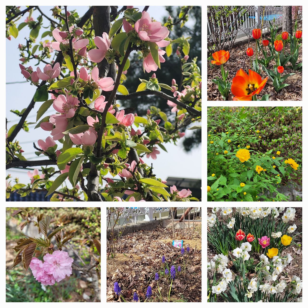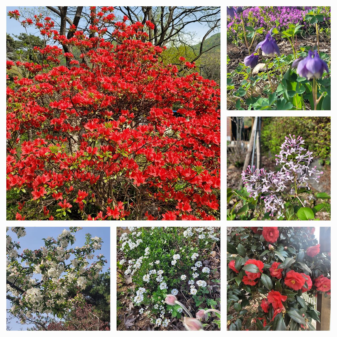 흰색의 수선화와 이베리스 그리고 사과꽃, 선홍색 영산홍, 분홍빛 꽃잔디와 연분홍 모과꽃, 빨간 할미꽃과 동백꽃, 자줏빛 라일락과 제비꽃 그리고 하늘매발톱, 노란 황매화와 노랑, 빨강, 아이보리의 다채로운 튤립 등 마당은 그야말로 색의 향연이다. 붉은색이라 해서 다 같은 그 색깔이 아니다. 영산홍이나 튤립을 보고 있으면 사람이 표현해 낼 수 없는 색이란 생각이 든다. 진해도 이보다 진할 수 없고 설탕 코팅이 된 것처럼 반짝인다. 오직 눈으로 보아야 그 색감을 오롯이 느낄 수 있다.