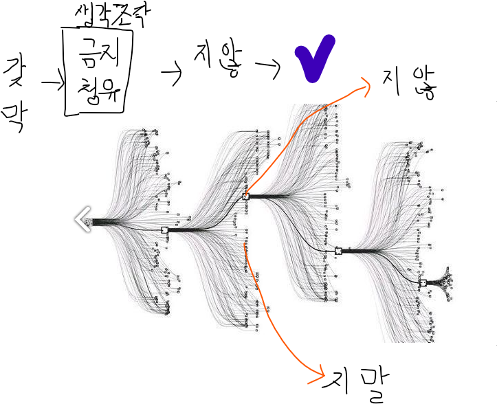 좌측 그림은 알파고의 처리 과정을 도식화한 그림에 아주 서툰 몇 가지 표시를 더한 것이다. (1), (2)와 같은 발화를 하는 과정에서 머리 속에서 일어나는 일을 설명하기에 도움이 될 수 있을 것 같다. '갓-, 막-'까지 발화한 시점에서 이어질 발화를 생성하는 과정은 어쩌면 좌측 그림과 같을지 모른다. 행위는 동사 '갖- 막-'으로 표상했고 그 행위의 유형을 판단하는 단계에서는 <금지 청유>로 표현해야 한다는 처리를 한다. 다음 이에 해당하는 언어 표현 목록(사전?)을 검색하면 다양한 표현이 있다. 그 중에서 어떤 이유에서인지 '-지 않-'을 선택한다. 그렇다면 위 네 가지 지식을 검색해서 가장 적절한 문법 지식을 선택하는 'V' 단계가 된다. 이 단계에서 적어도 세 가지 목록을 상정할 수 있다. '지 않아야 한다는 말', '지 말자는 말', '지 말아야 한다는 말'. 그 중에 전 단계의 <금지 청유>의 영향을 받아서 'V'단계에서 '지 말자는 말'이 선택된다. 신경망으로 치자면 가중치가 엉뚱한 영향을 끼쳤거나 모종의 편향이 작용한 것으로 생각해 볼 수 있을 것이다. 이 단계에서 발화 실수를 인식하지 못하고 계속 언어 처리를 수행한 결과 (1), (2)와 같은 문장을 발화했을 가능성을 없는 것일까?