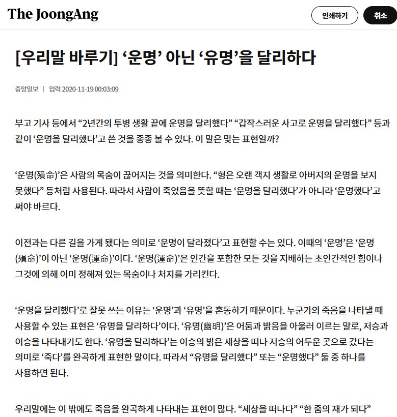 기사를 보면 사람들이 꽤나 자주 사용하지만 제대로 학습하지 않은 상태로 사용하는 경우가 많음을 알 수 있다. 이런 오류(?)는 또 다른 아종어는 변한다. 왜 변하느냐? 여러 이유가 있겠지만, 정확하게 습득하지 못해서 변하는 경우도 있다. 정확하게 학습되지 않은 표현의 오용(?)은 소위 '있어 보이는' 표현들 중에 많이 나타난다. 그 중 하나가 '유명을 달리하다'일까??