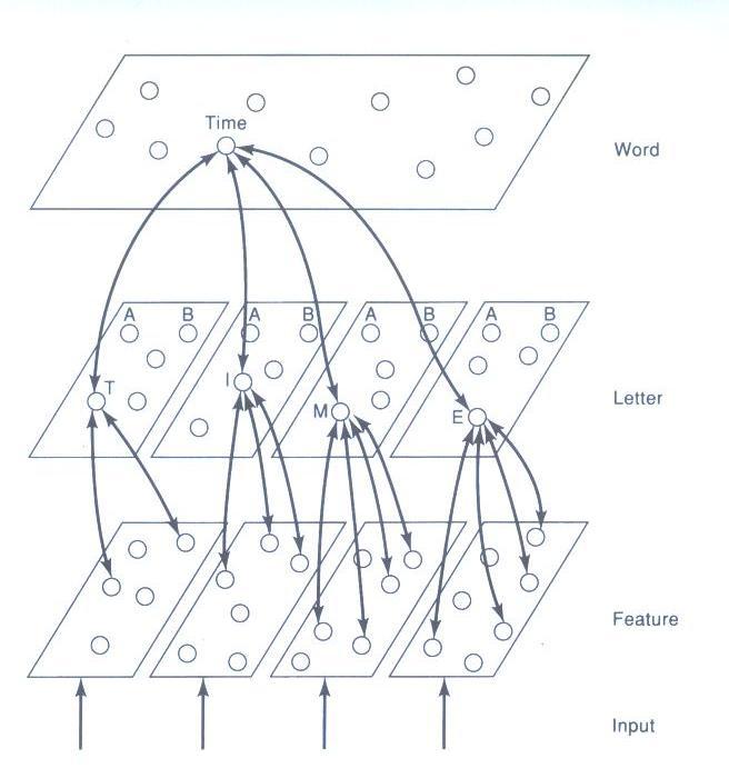 시각 피질에서 활성화되는 자극들이 모여서 'Letter'(문자) 처리 층위에서 'T, I, M, E'에 해당하는 각각의 신경단위들을 자극하고, 다시 이들 자극이 모여서 'Time'이라는 단어 수준의 자극이 되는 계층적인 인지 처리 과정을 도식화한 그림이다. 한국어의 경우라고 하면 한글 자모 전체가 들어있는 'Letter' 층위에서 'ㅅ, ㅣ, ㄱ, ㅏ, ㄴ'에 해당하는 시냅스 연결이 모여서 '시간'을 표상하는 것으로 이해할 수 있다. 이런 그림을 보면 단어 수준의 정보 처리는 계층적인 구조의 시냅스 연결망으로 도식화할 수 있다는 건 어느 정도 상상이 된다. (인간의 두뇌가 작동하는 방식은 시각 정보만이 아니라 청각 정보의 경우도 유사하다. 얼굴 인식 과제에서도 마찬가지이다. 두뇌의 정보 처리는 모두 비슷한 구조로 이루어진다.)