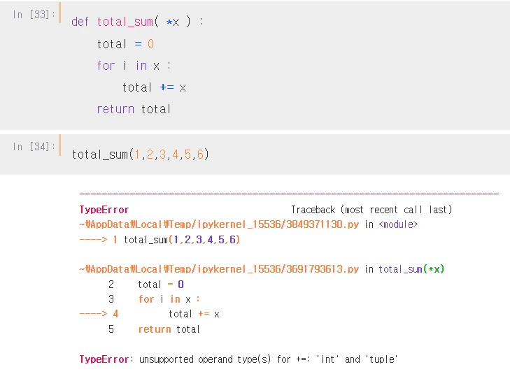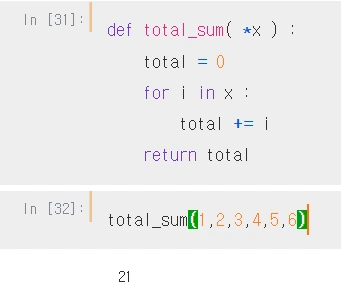 왼쪽 그림에서 [31]은 어떤 수들을 입력하면 그 수들의 합을 구해 주는 함수를 정의하는 파이썬 코딩이다. [32]는 1~6까지의 합을 구하도록 정의한 함수 'tatal_sum'을 실행하고 결과값으로 '21'을 얻은 것을 보여 준다. 입력한 수들 'X1 ~ Xn'을 순차적으로 'i'로 받아서 'total'이라는 변수에 더하는 함수를 정의했고, 잘 작동했다.