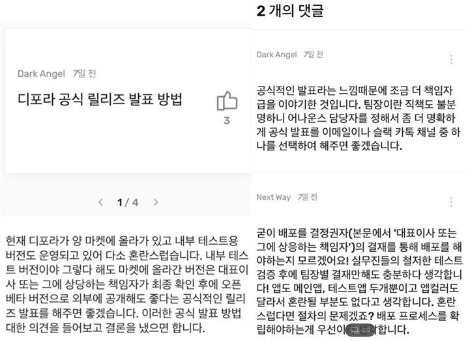 위 안건은, 3월 3일 주간회의 안건으로 등록됐던 의견이다. 사운을 걸고 개발하는 디포라의 공식 릴리즈 발표 방법인 만큼, 구성원들의 관심만큼 의견도 다양했다. 그럼에도 불구하고, 디포라를 통해 제안에 대한 충분한 사전 숙지와 의견 공유가 이루어짐에 따라 이 안건에 대한 결과를 도출하는 데 큰 시간을 소비하지 않았다.