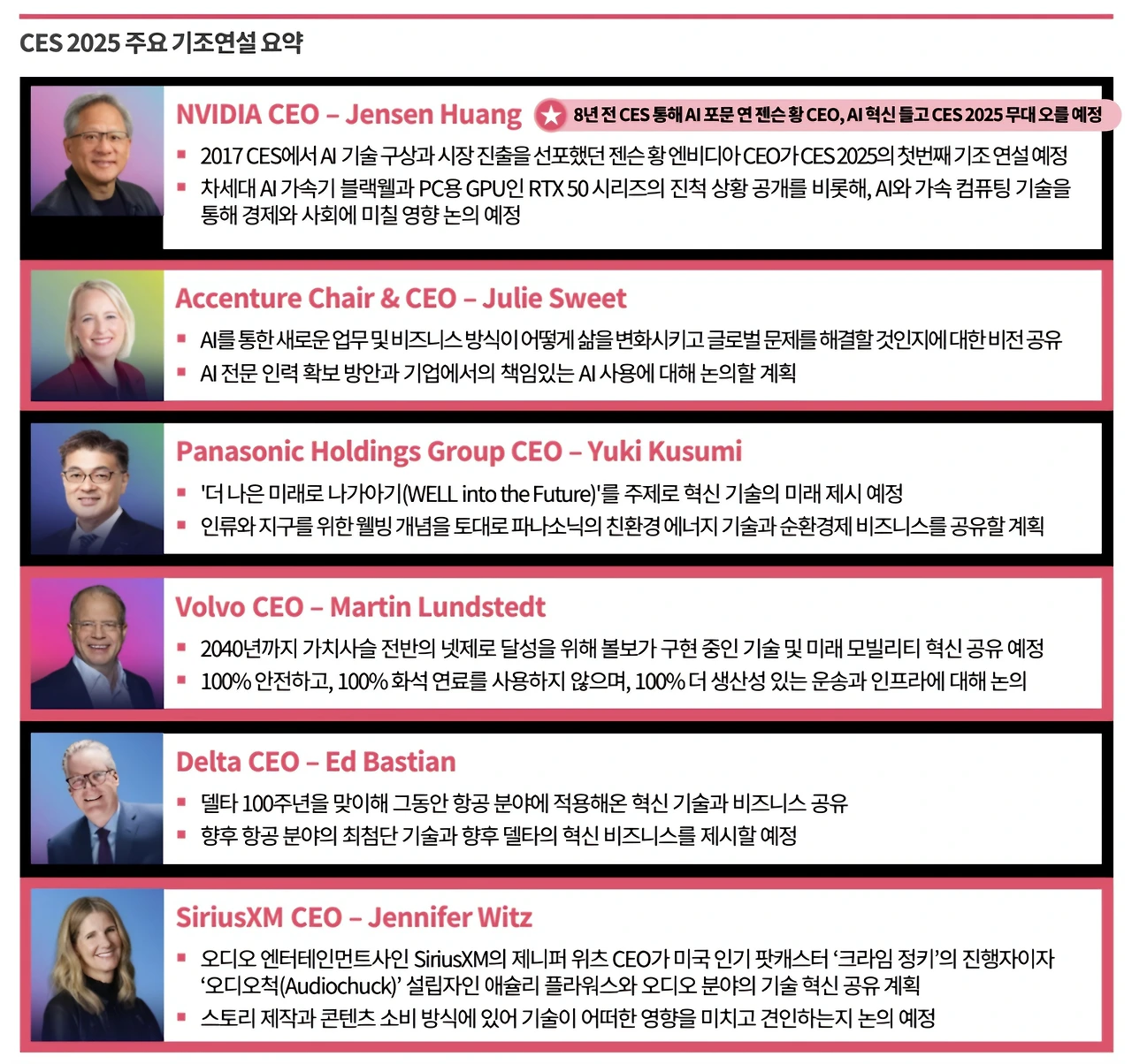 전통적으로 CES는 IT 시장의 트렌드를 선도하는 리더들의 기조연설(Keynote Speech)과 수많은 컨퍼런스를 통해서 그해 IT업계를 비롯한 산업계를 관통할 주제와 미래 산업의 발전 방향을 논의한다. 기조연설의 경우 젠슨 황 엔비디아 CEO의 개막연설을 시작으로 에드 바스티안(Ed Bastian) 델타항공 CEO, 마틴 룬드스테트(Martin Lundstedt) 볼보그룹 CEO, 제니퍼 위츠(Jennifer Witz) 시리우스XM CEO 등 세계적 기업인들이 연단에 오른다. 그리고 컨퍼런스에는 각계각층의 수많은 IT와 콘텐츠 전문가들, 그리고 평론가들이 등장하여 AI 기술을 중심으로 다양한 이슈를 논의하게 될 것이다. 이들의 기조연설과 발표, 토론 내용에는 최근 IT 트렌드에 대한 통찰뿐만 아니라, 2기 트럼프정부 출범에 대한 이들의 인식과 향후 대응 전략 등도 자연스럽게 녹아들어 갈 것으로 보인다. 연사들 발언의 행간을 잘 읽어야 하는 이유이다.