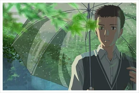 이렇게 시작된 두 사람의 만남은 곧이어 시작된 장마와 함께 본격적으로 진행된다. 구두 디자이너를 꿈 꾸는 다카오는 아르바이트로 바쁜 와중에도 그녀의 발에 맞는 신발을 만드는 작업에 들어가고, 알 수 없는 상실감으로 가득해 보이는 여인은 그러한 다카오의 관심을 위안으로 받아들이는 것 같다. 그렇게 한 여름밤의 꿈과도 같은 두 사람의 만남은 잔뜩 물에 젖은 배경 화면과 가시와 다이스케의 피아노 소리의 설레임 속에서 진행된다.