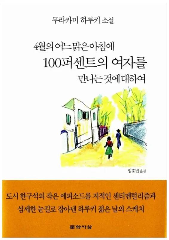 「4월의 어느 맑은 아침에 100퍼센트의 여자를 만나는 것에 대하여」. “꽃가게 앞에서, 나는 그녀와 스쳐 지나간다. 따스하고 자그마한 공기 덩어리가 내 피부에 와 닿는다. 아스팔트로 포장된 길 위에는 물이 뿌려져 있고, 주변에는 장미꽃 향기가 풍긴다. 나는 그녀에게 말을 걸 수도 없다...” 언제나 아련하기만 하였던 하루키의 소설 속 여성 인물들은 이렇게 시작된 것이 아닐까...