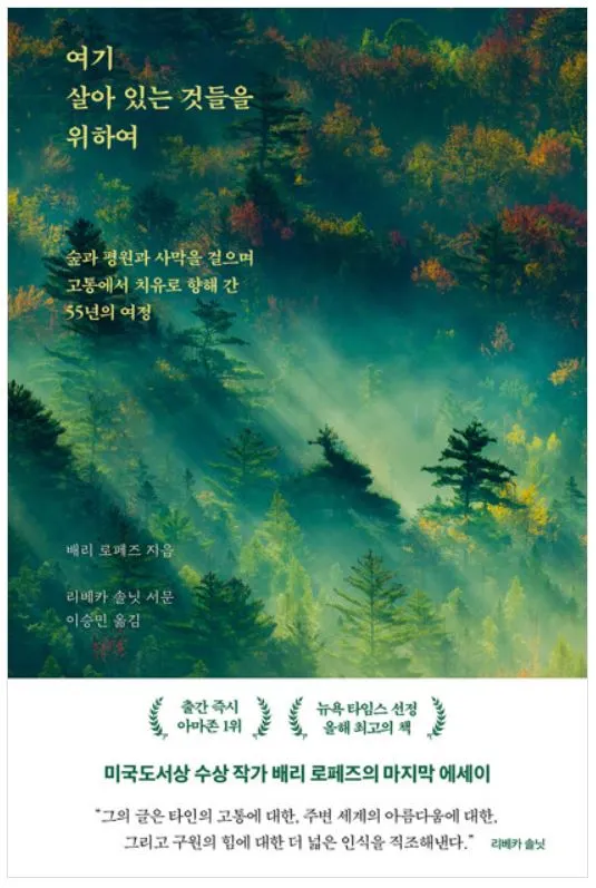 - 《호라이즌》이 배리 로페즈의 생전 마지막 책이라면 《여기 살아 있는 것들을 위하여》는 그의 사후 이 년여가 흐른 뒤 나온 책이다. ’숲과 평원과 사막을 걸으며 고통에서 치유로 향해 간 55년의 여정‘이라는 부제가 붙어 있는데, 책의 전반부에는 특히나 그가 겪은 어린 시절의 폭력 그리고 이를 벗어나기 위한 부단한 노력의 내용들이 담겨 있다. 위의 문단은 그 시간과 시기들의 뒤에 그가 깨달은 교훈이다.