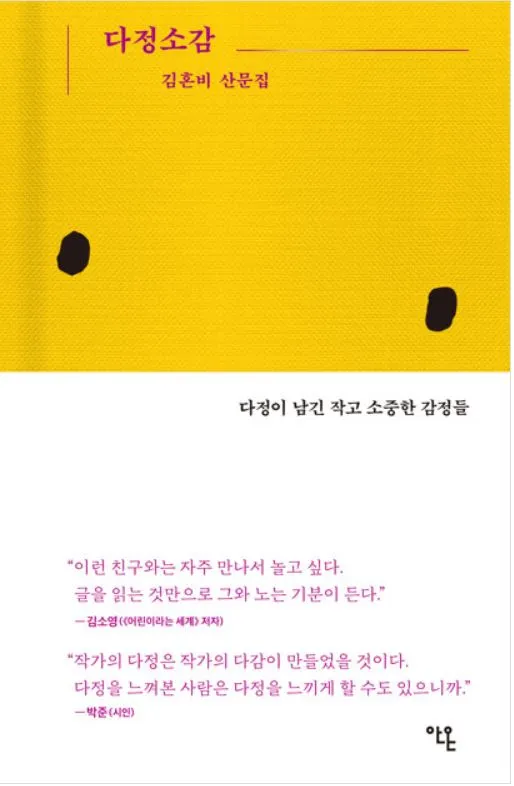 다시 한 번 말하건대, 그렇게 당도한 지금을 앞에 두고 읽기에 적당한 글들이 많다. 나이와 함께 부자연스럽게 팽창하는 자아를 제어하도록, 그러나 필요 이상으로 부끄러워하지 않을 수 있도록 손 내밀어 주는 것 같다. 작가가 바로 그러한 손길에 도움을 받았음을 실토하고 있으니, 《다정소감》이라는 제목의 산문집에는 저절로 수긍할만한, 떠올려 수긍하기에 좋은 글들이 다수 실려 있다.