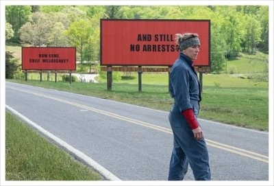 영화의 제목 그대로 미주리 주 에빙 시의 외곽에 있는 버려진 도로, 버려져 있던 세 개의 광고판에 어느 날 이런 문구가 실린다. “RAPED WHILE DYING”, “AND STILL NO ARRESTS?”, “HOW COME, CHIFE WILLOUGHBY?” 죽어가는 동안에도 강간당했다, 아직도 범인을 못 잡은 거야? 어떻게 그럴 수 있지 윌러비 서장? 이런 의미의 단어들로만 이루어진 광고이다. 그리고 이 광고판을 임대한 것은 바로 딸이 살해당했고, 범인을 잡지 못한 채, 여전히 살아가야 하는 엄마 밀드레드이다.