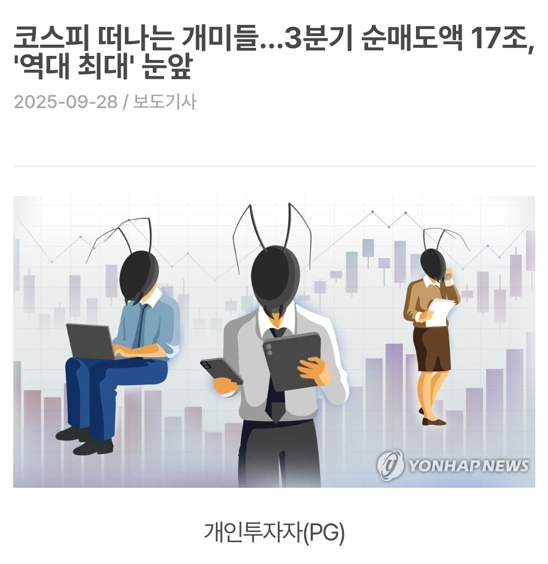내가 대출을 실행하고 1,200만 원어치 주식을 풀매수한 직후, '영끌 국장 개미' 타이틀을 달았을 때, 시장에서는 "코스피를 떠나는 개미들"이라는 무시무시한 제목의 기사가 쏟아졌다. 그들이 17조 원을 팔아치운 배경에는 다음과 같은 복합적인 이유들이 있다고 했다.