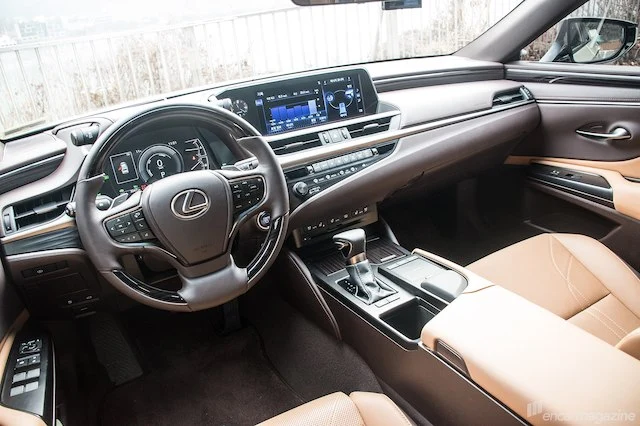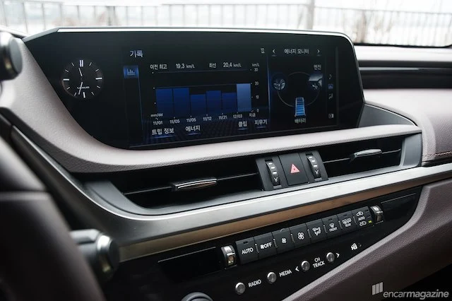 새롭게 짠 렉서스 ES 300h의 인테리어의 장점은 크게 두 가지 정도. 먼저 사용성과 미적 감각 모두를 살린 센터페시아의 레이아웃입니다. 중앙 스크린의 크기를 키웠지만 자주 필요한 기능들은 버튼으로 꺼내어 놓았습니다. 다이얼과 버튼들의 조작감도 확실합니다. 아쉽게도 스크린의 터치는 지원하지 않습니다. 두 번째는 시트를 포함한 곳곳에 두른 가죽의 품질입니다. 최고 등급에는 세미 아드레날린 천연가죽 시트로 업그레이드되지만 일반 천연가죽(럭셔리와 럭셔리 플러스) 시트도 충분히 고급스럽습니다.