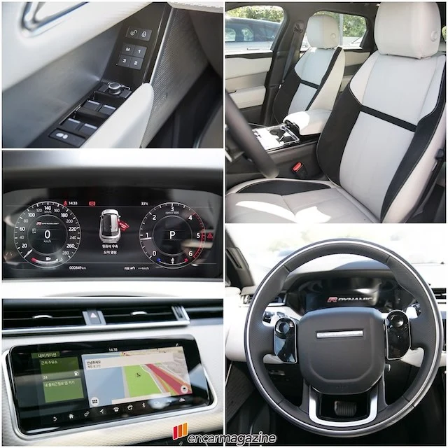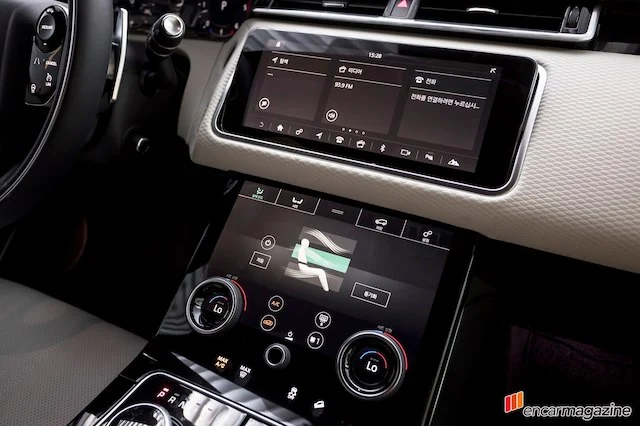 실내로 들어가면 센터 상·하로 자리한 10인치 스크린 두 개가 시선을 압도한다. 과거 인피니티 Q50에서 경험한 바 있다. 랜드로버는 이를 '터치 프로 듀오(Touch Pro Duo) 인포테인먼트 시스템'이라 부른다. 상단 스크린에서는 내비게이션, 미디어, 전화를 제어할 수 있으며, 하단에서는 공조 시스템과 시트 등을 조절할 수 있다. 상단 스크린은 시동을 걸면 30도가량 기울여져 보기 편한 각도로 변하며, 운전자가 각도를 조정할 수 있다.