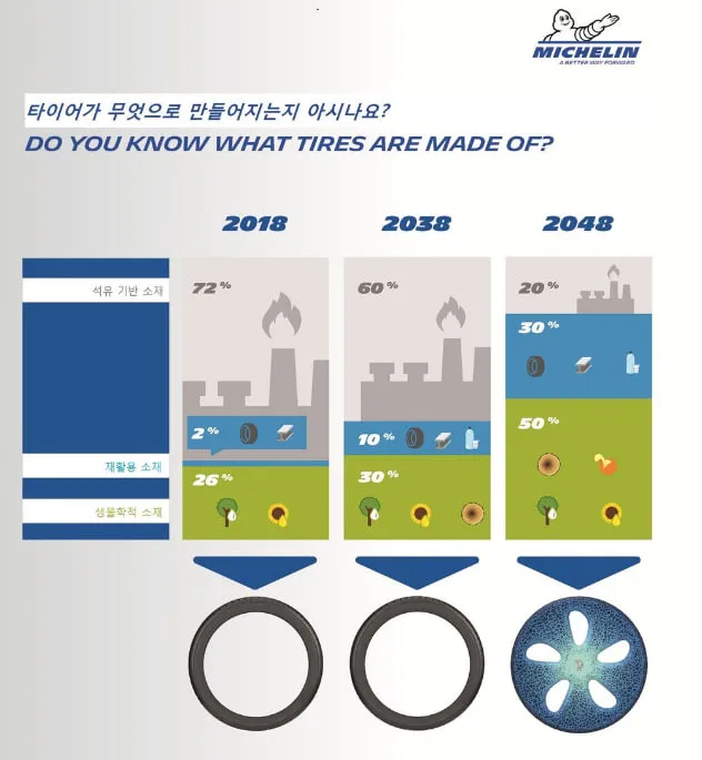 타이어 제조사들도 이를 방관하는 것만은 아닙니다. 미쉐린은 2048년까지 타이어 원료 80%를 친환경 소재로 전환하겠다는 계획을 발표했습니다. 석유 기반의 탄성중합체를 나무와 비슷한 우드 칩으로 대체하겠다는 의지입니다. 참고로 지난해 기준 미쉐린 타이어의 석유 기반 원료 사용은 72% 수준입니다.