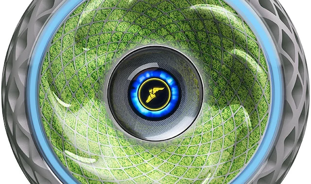 한국 타이어는 공기가 필요 없는 미래 타이어 '아이플렉스'를 선보였습니다. 촘촘한 그물 형태로 볼륨감을 구현했다. 독특한 외형만큼 주목해야 할 점은 재활용이 쉬운 우레탄 유니소재(UNI-Material)를 활용했다는 것입니다.