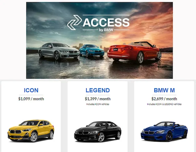 미국 내슈빌 지역에서 서비스 중인 '엑세스 바이 BMW(Access by BMW)'는 다양한 회원 등급과 다양한 차종이 특징이다. 구독자도 아이콘, 레전드, BMW M으로 분류된다. 아이콘 등급의 구독자는 월 110만 원 정도를 지불하고 BMW 330i, 330e, X2, X3, M240i, i3를 월 단위로 선택할 수 있다. 레전드 회원은 540i, X5, 440i, M2 쿠페 등이 추가된다.