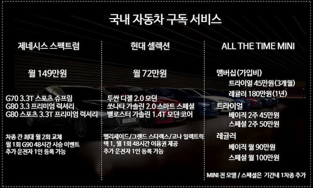 국내에는 현대차와 제네시스, MINI가 자동차 구독 서비스를 론칭했다. 현대·제네시스 경우는 별도의 가입비를 두지 않아 진입 장벽을 낮췄다. 현대·제네시스의 경우 기간 멤버십 비용이 없어 1개월 사용도 가능하다. 2개월째부터는 구독을 종료하면 일 단위로 계산해 구독료를 돌려받을 수 있다. 아쉬운 점도 있다. 제네시스는 성격이 서로 살짝 다른 세단 라인업이 전부. 현대 셀렉션 역시 기본 선택지가 많지 않다. 또한 'ALL THE MINI' 는 별도의 멤버십 비용이 필요하다. 3개월이 기본인 트라이얼과 1년 회원 자격의 레귤러가 있다. 단 트라이얼 사용자는 차를 선택할 수 없으며 무작위로 배정된다.