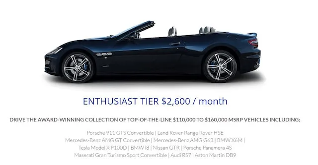 월 260만 원 정도를 지불하는 마니아의 경우 포르쉐 911 GTS 컨버터블, AMG GT, BMW X6M, 레인지로버 등으로 미국에서 11만~16만 달러로 판매되는 라인업이다. 약 190만 원을 지불하는 럭셔리 회원은 렉서스 LC500, 레인지로버 스포츠, 911 카레라 등으로 8만~11만 달러로 구성됐다.
