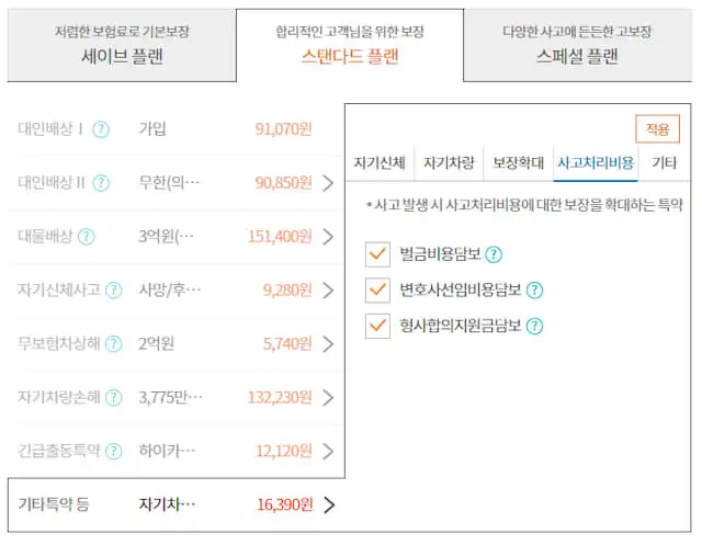 운전자 보험과 법률지원 특약의 차이점은 전체 비용과 추가 보장 내용으로 요약된다. 만 35세 남성 자가용 운전자 기준(H사)으로 법률 지원 특약(사고처리비용)은 연간 자동차 보험료에 16,390원이 더해진다. 전체 보험료 100만 원을 기준으로 하면 약 1.6%에 해당하기에 큰 부담은 아닐 것이다.