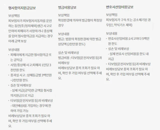 Tip. 두 가지 방법 모두에서 보상하는 형사합의금 지원, 벌금 지원, 변호사 선임 지원 보장은 중복 보상이 되지 않으므로 둘 모두를 가입할 필요는 없다.