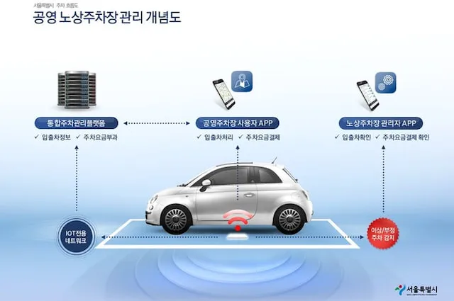 노상 주차장에서는 노면에 설치한 센서를 이용합니다. 센서는 사용자의 스마트폰 앱과 실시간 통신합니다. 주차 시간을 정확히 계산할 수 있죠. 서울시는 2020년 8월까지 109곳으로 '지갑 없는 주차장'을 확대할 계획이라고 밝혔습니다.