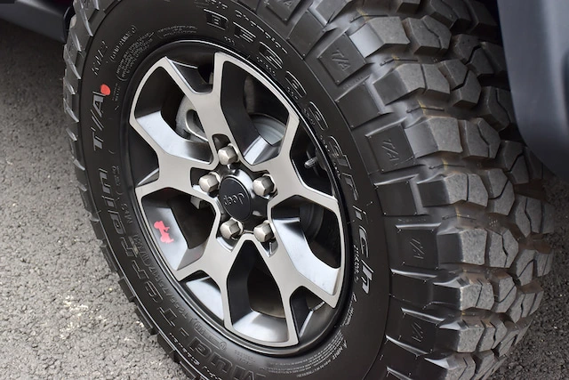 랭글러 루비콘(파워탑 포함)에는 17인치 BF 굿리치 머드 타이어(Mud-Terrain T/A KM2)가 기본으로 장착됩니다. 외경으로 따지면 32인치에 달하죠. 장착된 타이어의 값만 500만 원 상당이라고 합니다. 이렇게 거친 외모를 띈 타이어로도 부담스럽지 않은 온로드 주행 성능을 내는 게 놀랍습니다.