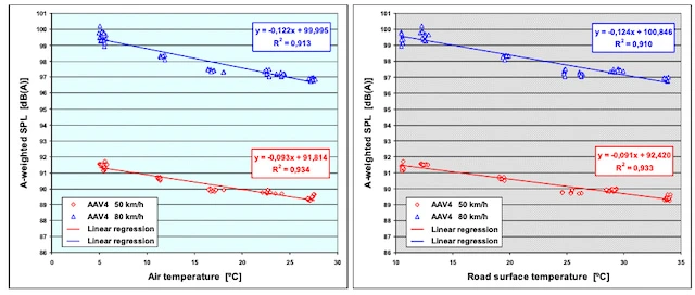 결과는 간단명료했습니다. 대기 온도, 그리고 노면 온도가 낮을수록 타이어와 도로 사이에서 생기는 소음이 크게 측정됐습니다. 시속 50km로 운행할 때 외부 기온이 20도 낮아지면 소음은 1.8bB 가량 증가했습니다. 속도를 높이면 기온 간 소음 편차는 조금 더 늘어납니다.